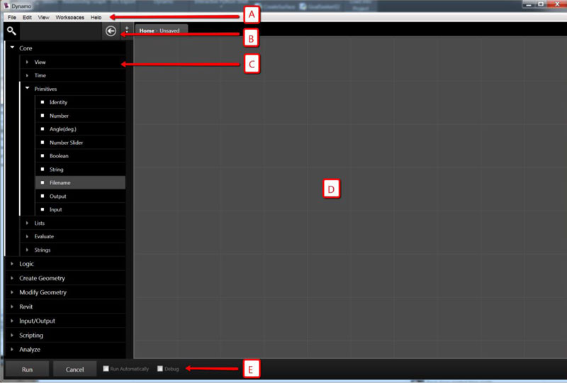 اما تجربهی اندک استفاده ما از افزونهی Dynamo در محیط نرمافزار Revit، ویژگیهای آن را بیشتر برای ما آشکار ساخت. این ویژگیها طبیعتا بر اساس میزان پاسخگویی نرمافزار به خواستهها و نیازهای کاربر و همین طور مقایسه آن با نرمافزارهای مشابه به دست آمده است. در نگاه اول Dynamo بر خلاف Grasshopper محیط گرافیگی جذاب و خلاقانهای ندارد. اجزاء (Node) در Dynamo به صورت نواری کشویی در سمت چپ صفحه قرارگرفتهاند که یافتن هر جزء را برای کاربر بسیار سخت میکند. همین طور سیستم جستوجوی آن نیز بر خلاف Grasshopper بسیار ضعیف عمل میکند و کاربر نمیتواند به سادگی به جزء موردنظر دست یابد. اما آنچه Dynamo را برای کاربران میتواند جذاب سازد، وجود چهار بخش کاربردی Revit ، Input/Output ، Scripting و Analyze در منوی آن است.